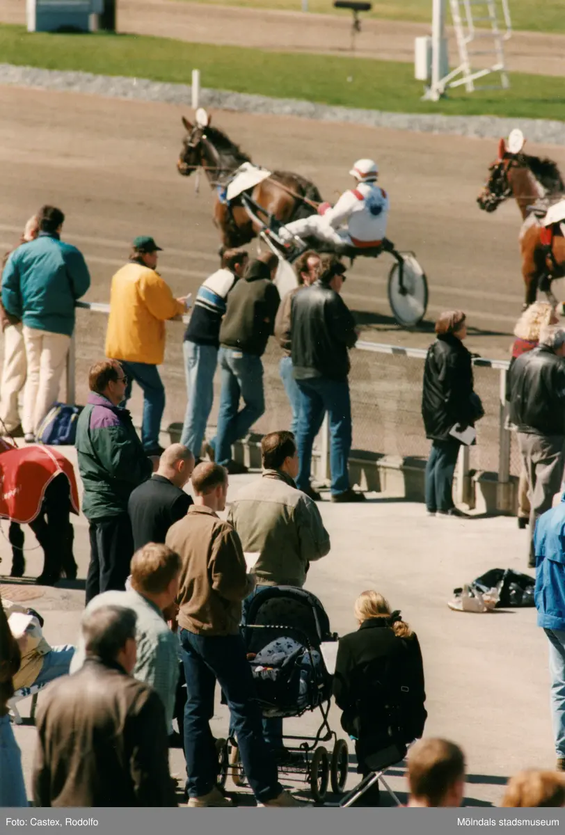 Titel: Publik som följer lopp på Åbytravet i Åby, Mölndal, under travloppet Drottning Silvias Pokal, söndagen den 3 maj 1997.
