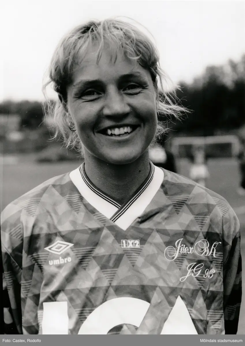 Porträtt av Jitex-spelaren Monica Magnusson taget i samband med match mellan Jitex BK och Wä IF på Kvarnbyvallen i Mölndal, år 1993-1994. Jitex BK vann matchen med 6-1. Monica Magnusson gjorde 5 av målen.