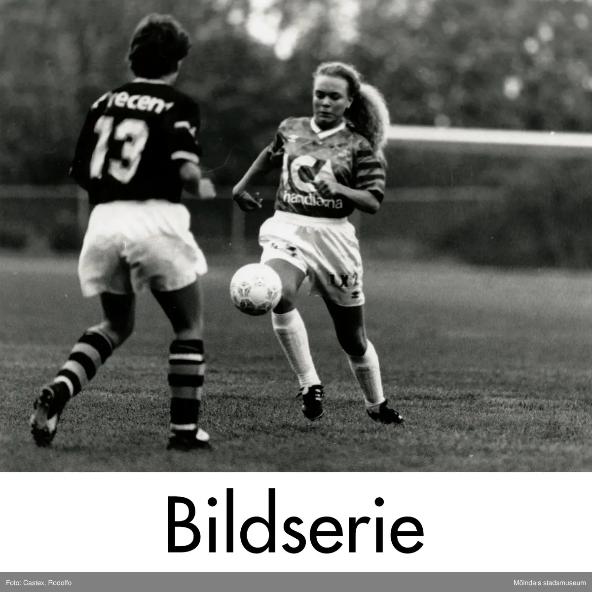 Serie om 18 svartvita fotografier som visar fotbollslaget Jitex BK spela match på Kvarnbyvallen i Mölndal, år 1993-1994.