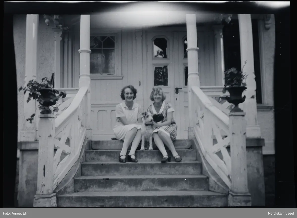 Två unga kvinnor, Elsa t.h., med en hund emellan sig, sitter på trappan till familjen Morthensens villa Solveden, Djursholm.