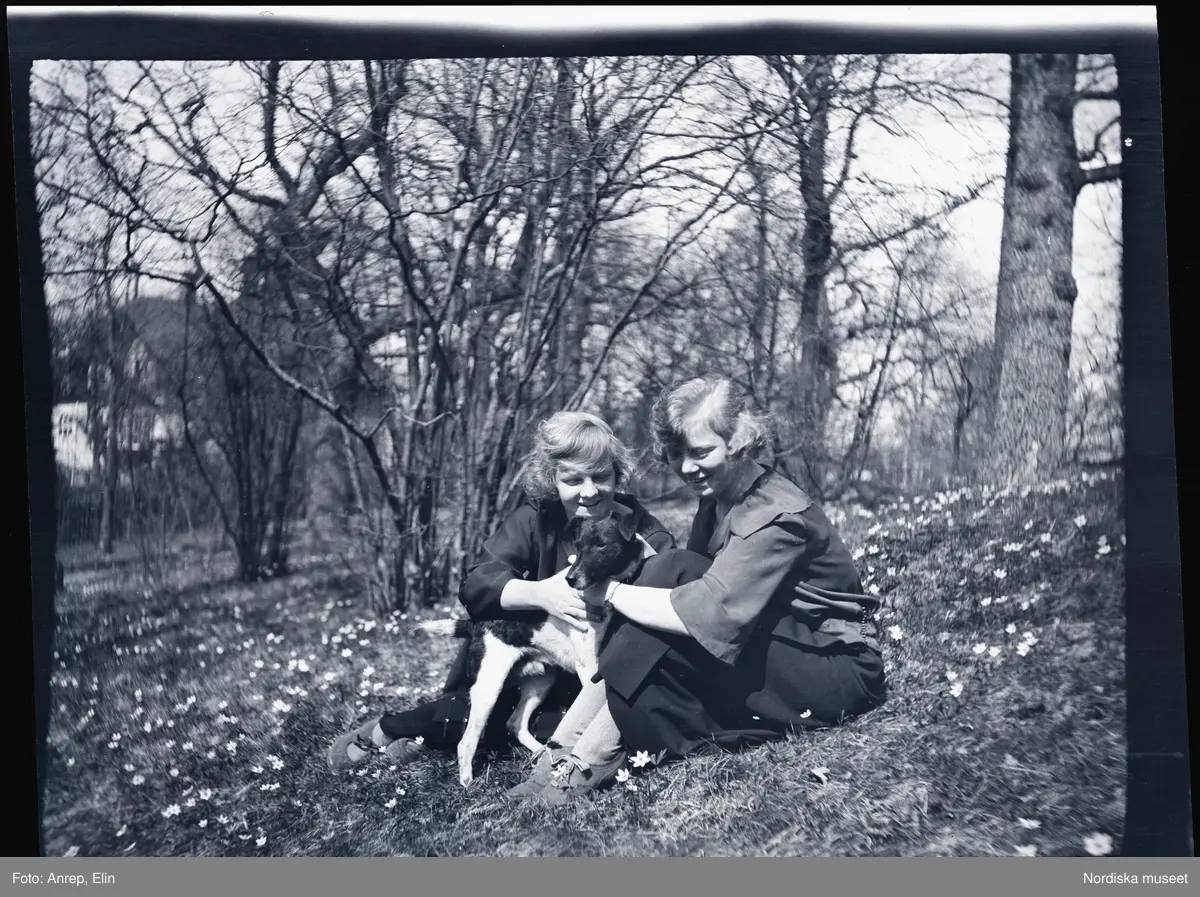 Systrarna Elsa och Gudrun med en hund, sitter bland vitsippor på tomten till familjen Morthensens villa Solveden, Djursholm.
