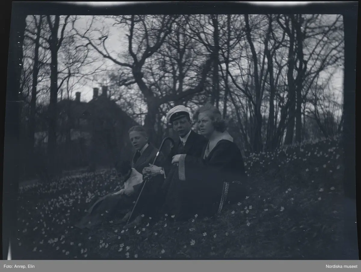 Tre av syskonen Morthensen sitter bland vitsippor på tomten till familjen Morthensens villa Solveden, Djursholm.
