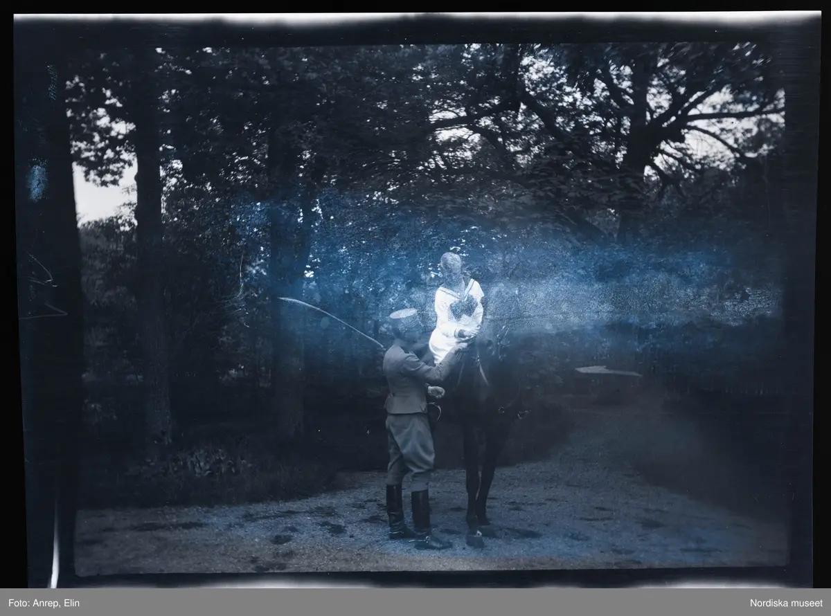 En ung kvinna till höst, en man i uniform står intill och håller tyglarna. Villa Solveden, Djursholm.