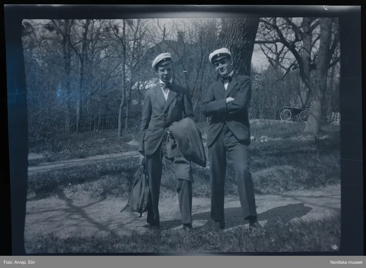 Sven och en vän med studentmössor på, porträtterade ute i familjen Morthensens tomt. Villa Solveden, Djursholm.