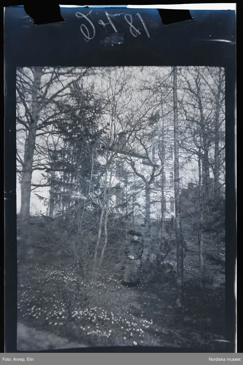 Elsa står i en backe med vitsippor på tomten till familjen Morthensens villa Solveden, Djursholm.