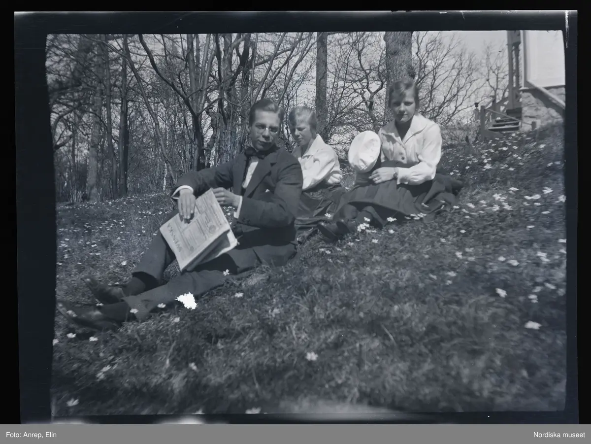 Sven, Gudrun och Elsa sitter ute på backen som blommar av vitsippor vid familjen Morthensens villa Solveden, Djursholm.