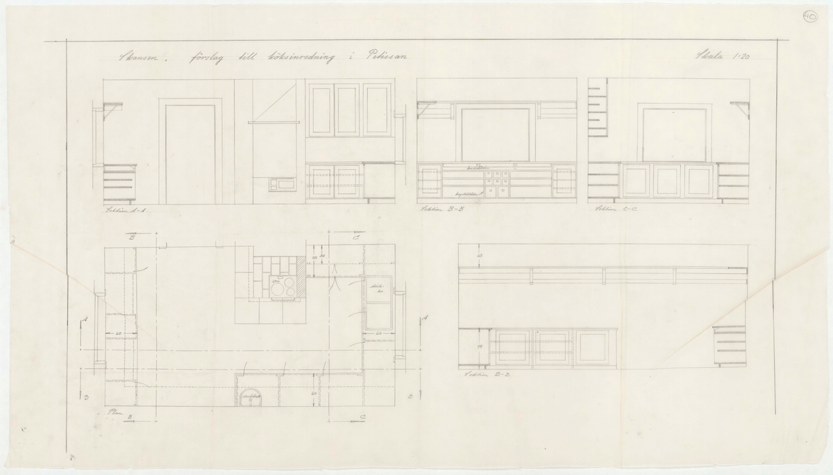 Titel: Apoteket/Petissan. Planritning. Fasadritning. Förslag till köksinredning i Petissan.