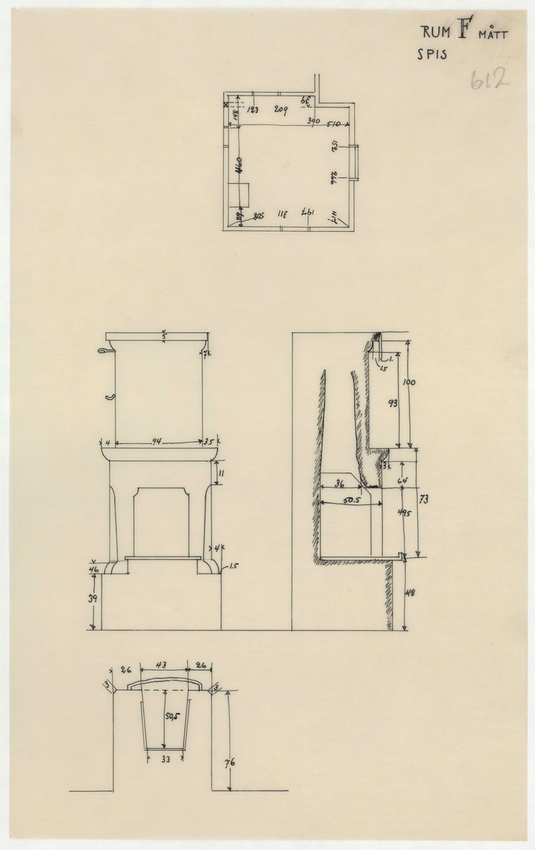 Titel: Skogaholms herrgård. Huvudbyggnaden. Detaljritning. RUM F. MÅTT. SPIS.
