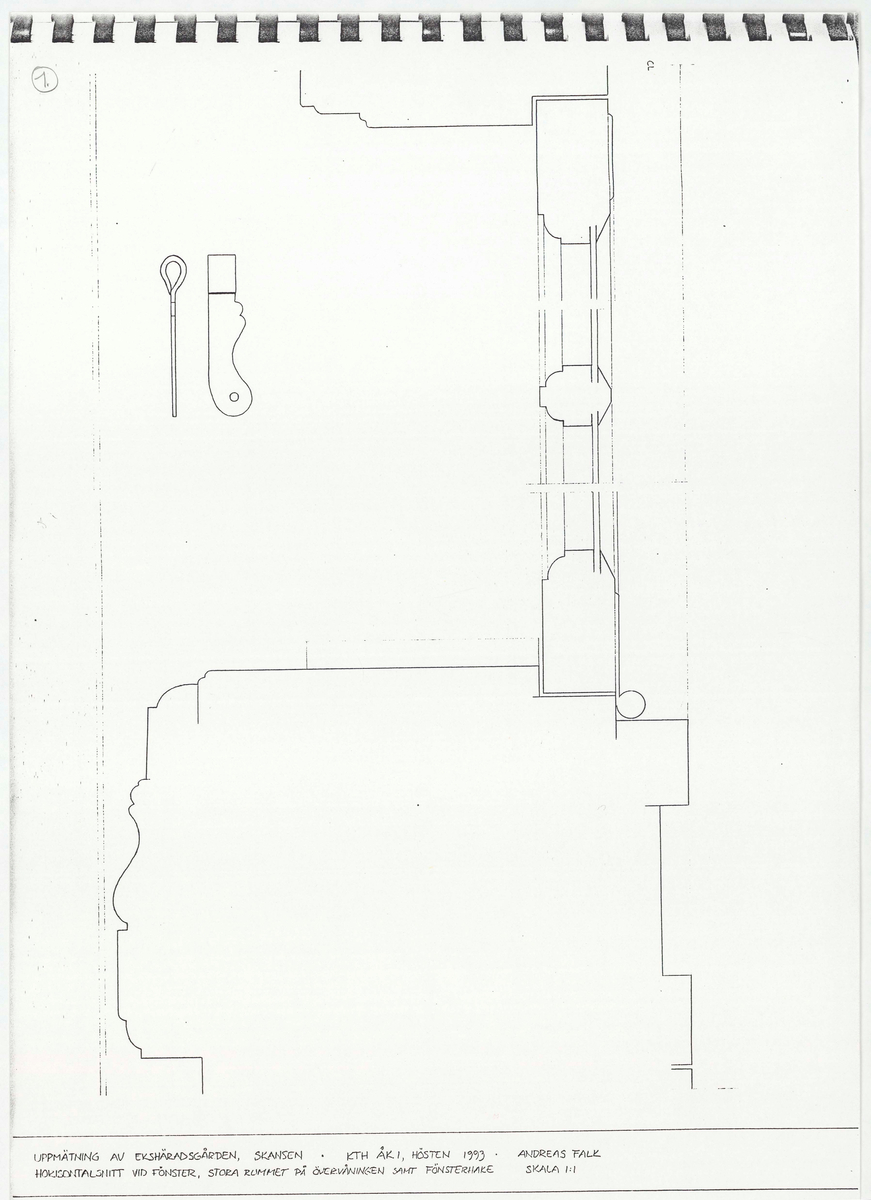 Horisontalsnitt vid fönster, stora salen, övervåningen samt fönsterhake.