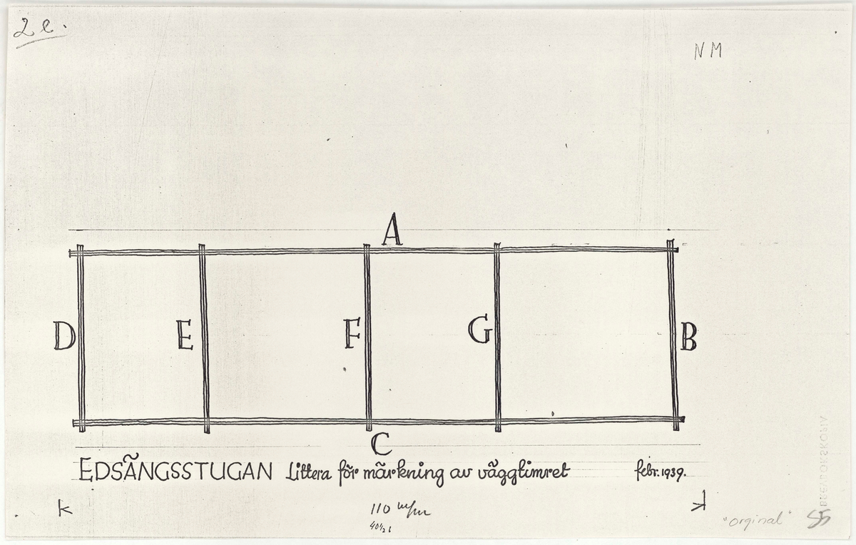 Titel: Delsbogården. Uppmätningsritning. Edsängsstugan. Litera för märkning av väggtimret.