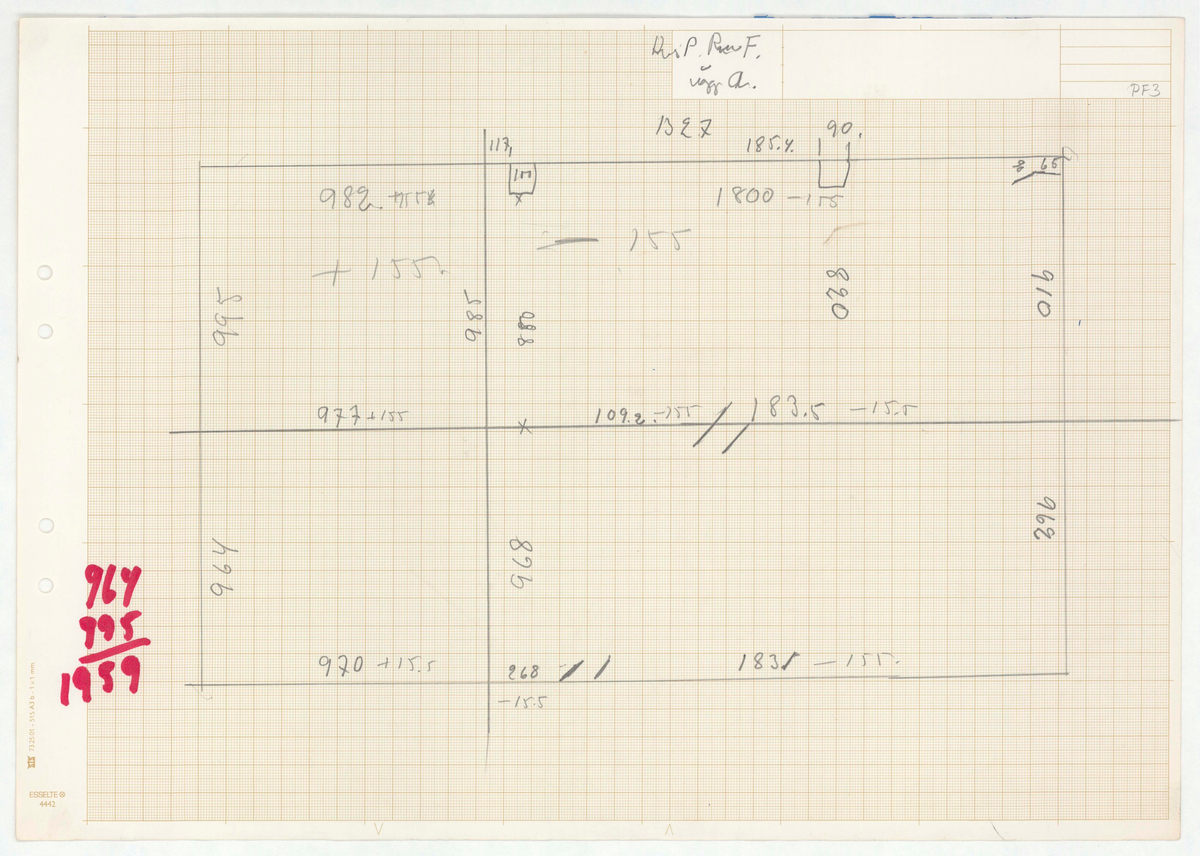 Titel: Skånegården. Bostadshuset. Detaljritning. Hus P. Rum F. Vägg a.