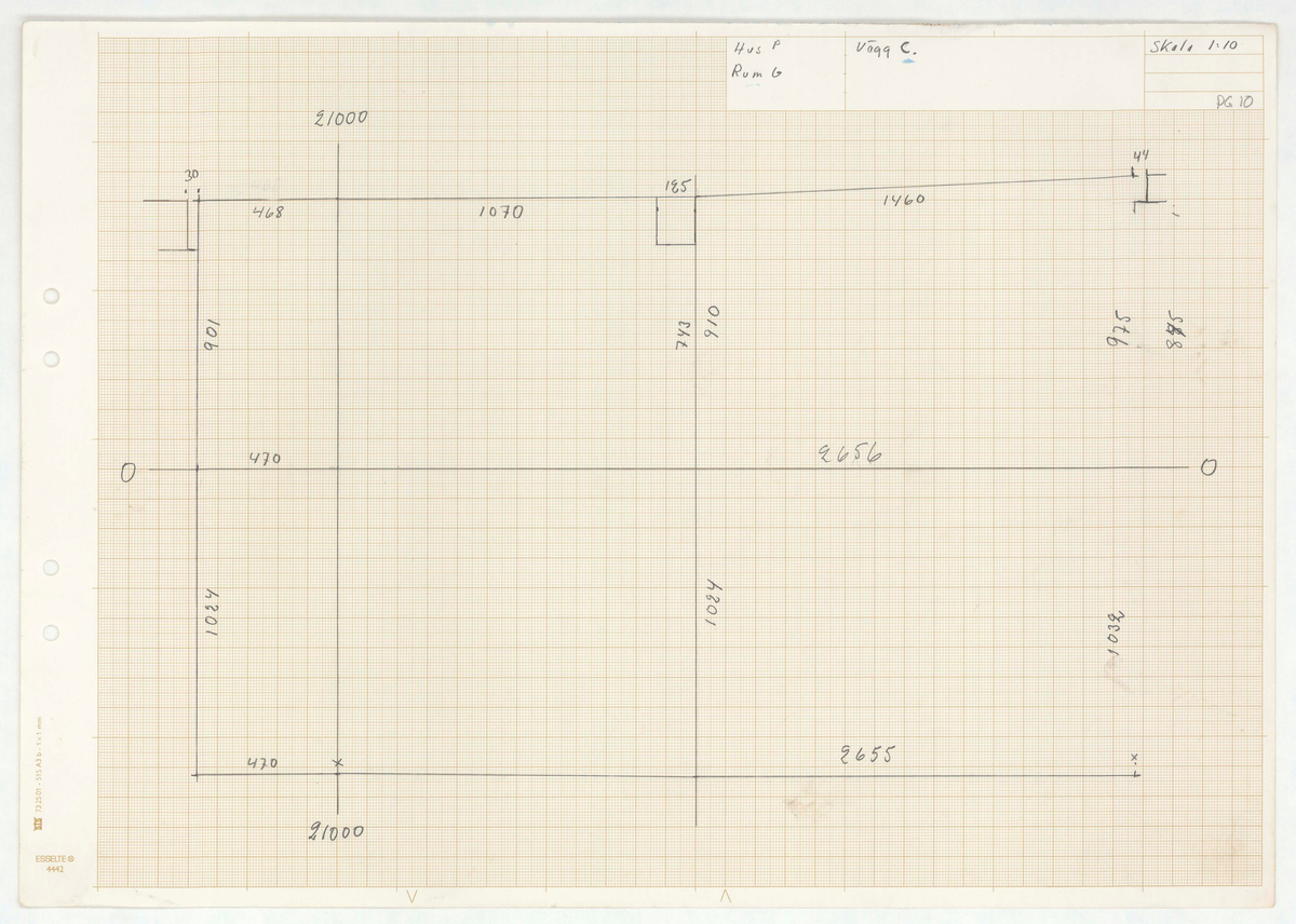 Titel: Skånegården. Bostadshuset. Detaljritning. Hus P. Rum G. Vägg C.