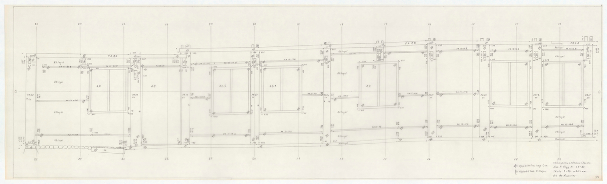 Titel: Skånegården. Bostadshuset. Detaljritning. Hus P. Vägg A. 13-25. Skala 1:10.