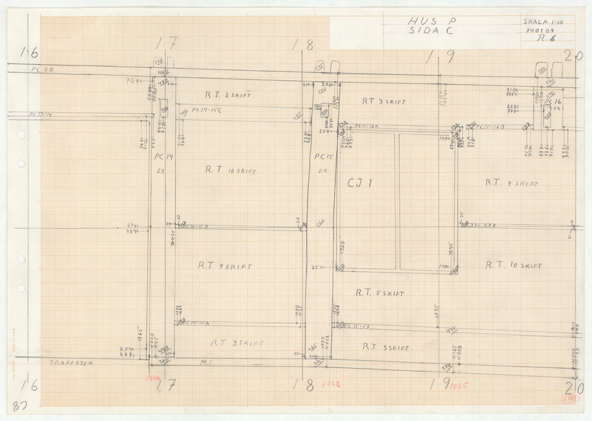 Titel: Skånegården. Bostadshuset. Detaljritning. HUS P. SIDA C. Skala 1:10