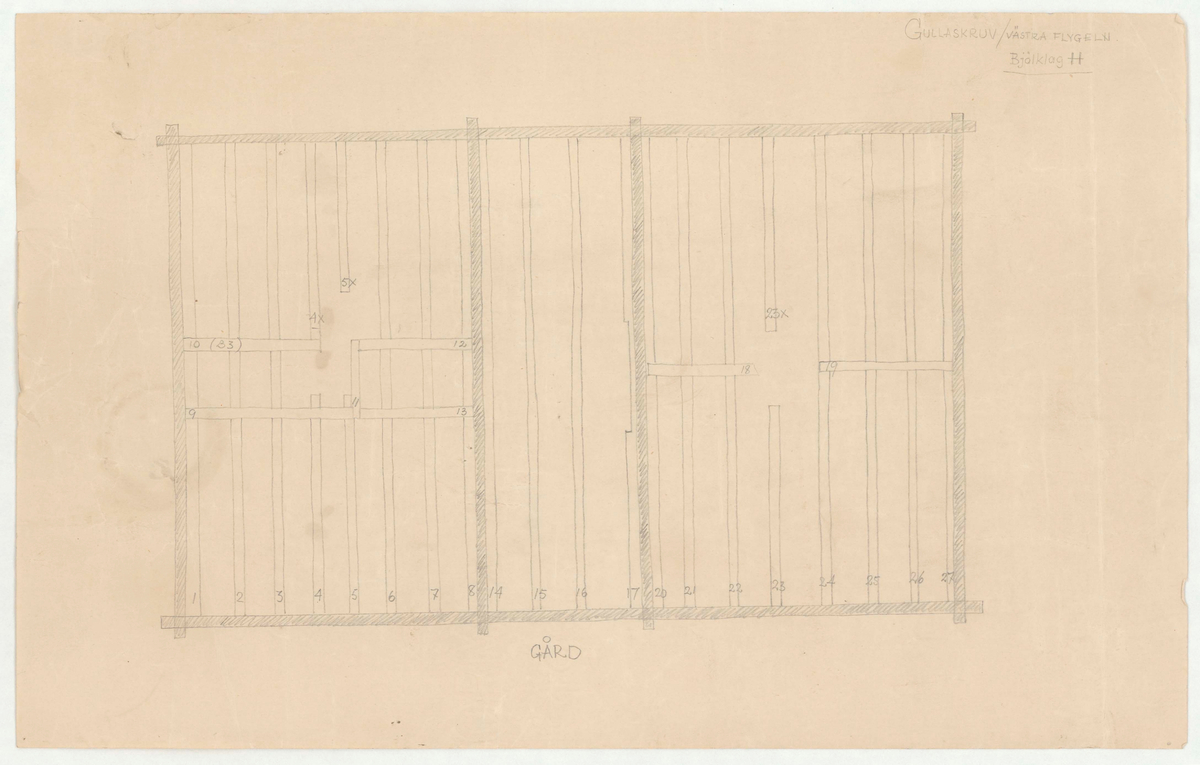 Titel: Skogaholms herrgård. Biblioteksflygeln. Planritning. Bjälklag H.