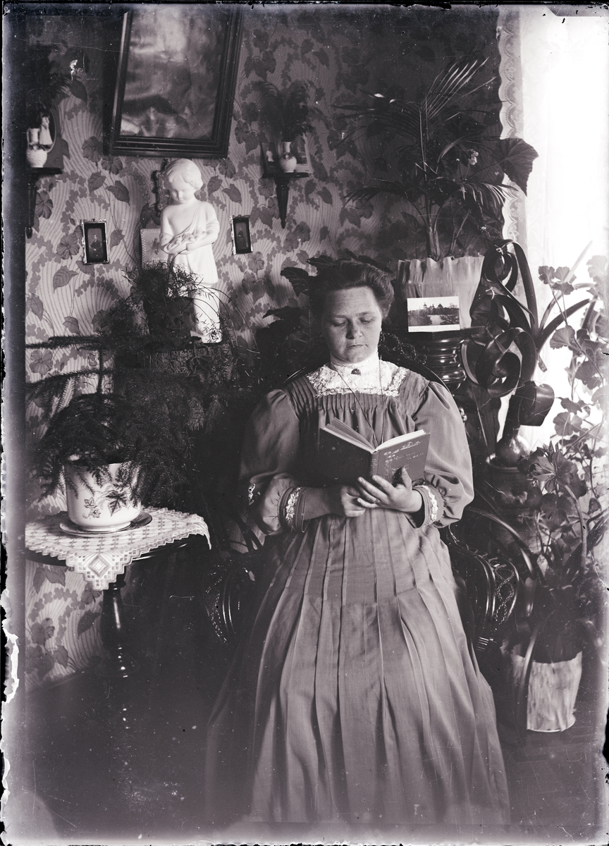 Kvinna som läser i en bok. Hannas syster i Ljurskabon?