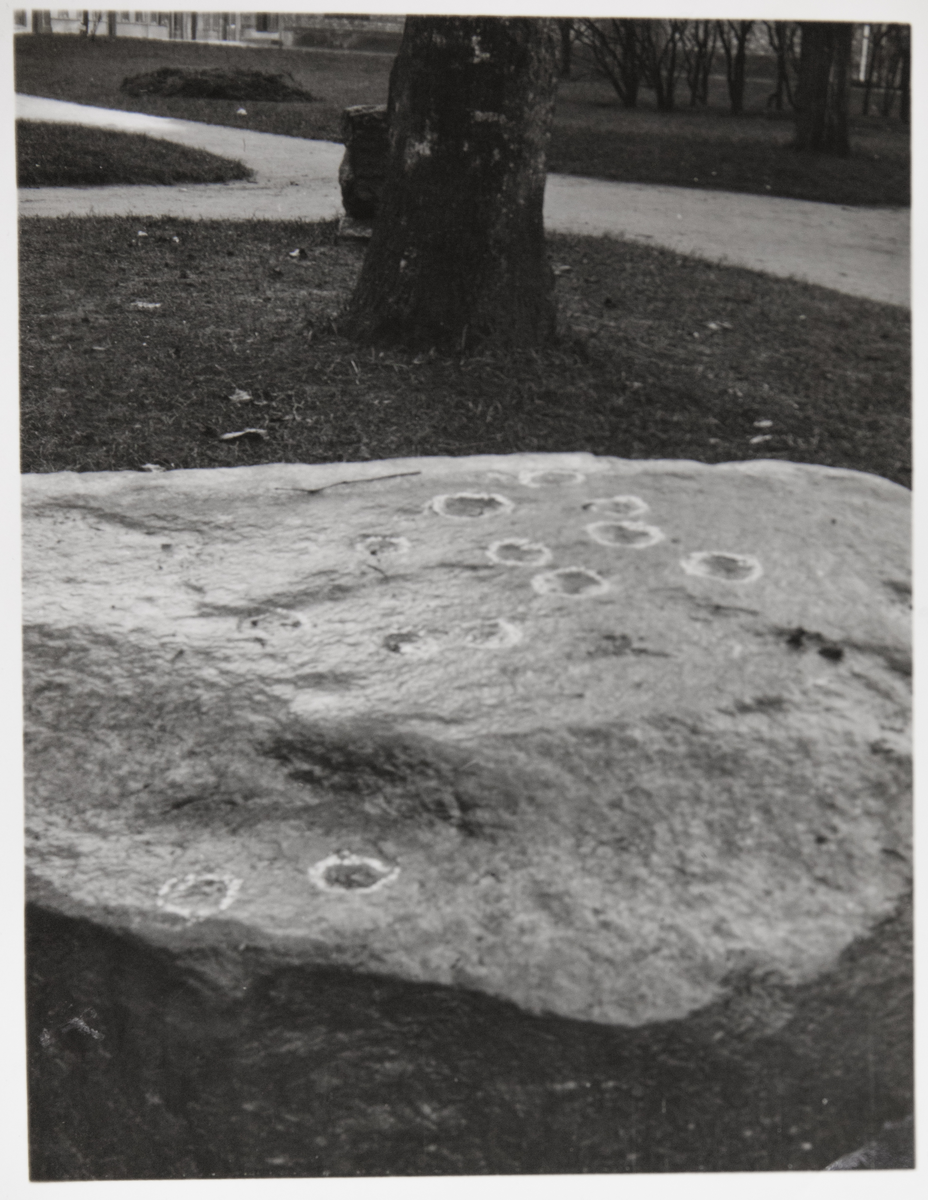Sten med skålgropar från Ravelsgården, Vänersnäs. På fotografiet är stenen placerad i parken framför Vänersborgs museum