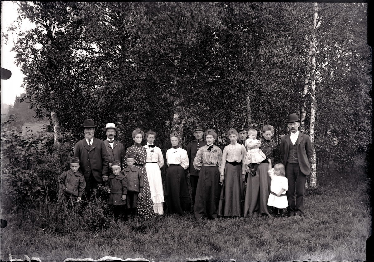 Nårunga. Från vänster: Barnen är Einar, Rudolf och Frithiof Hallhagen (Benjaminsson). Stående Benjamin Andersson, Fridolf Benjaminsson, okänd, Betty och Hanna Benjaminsson. Resten okända