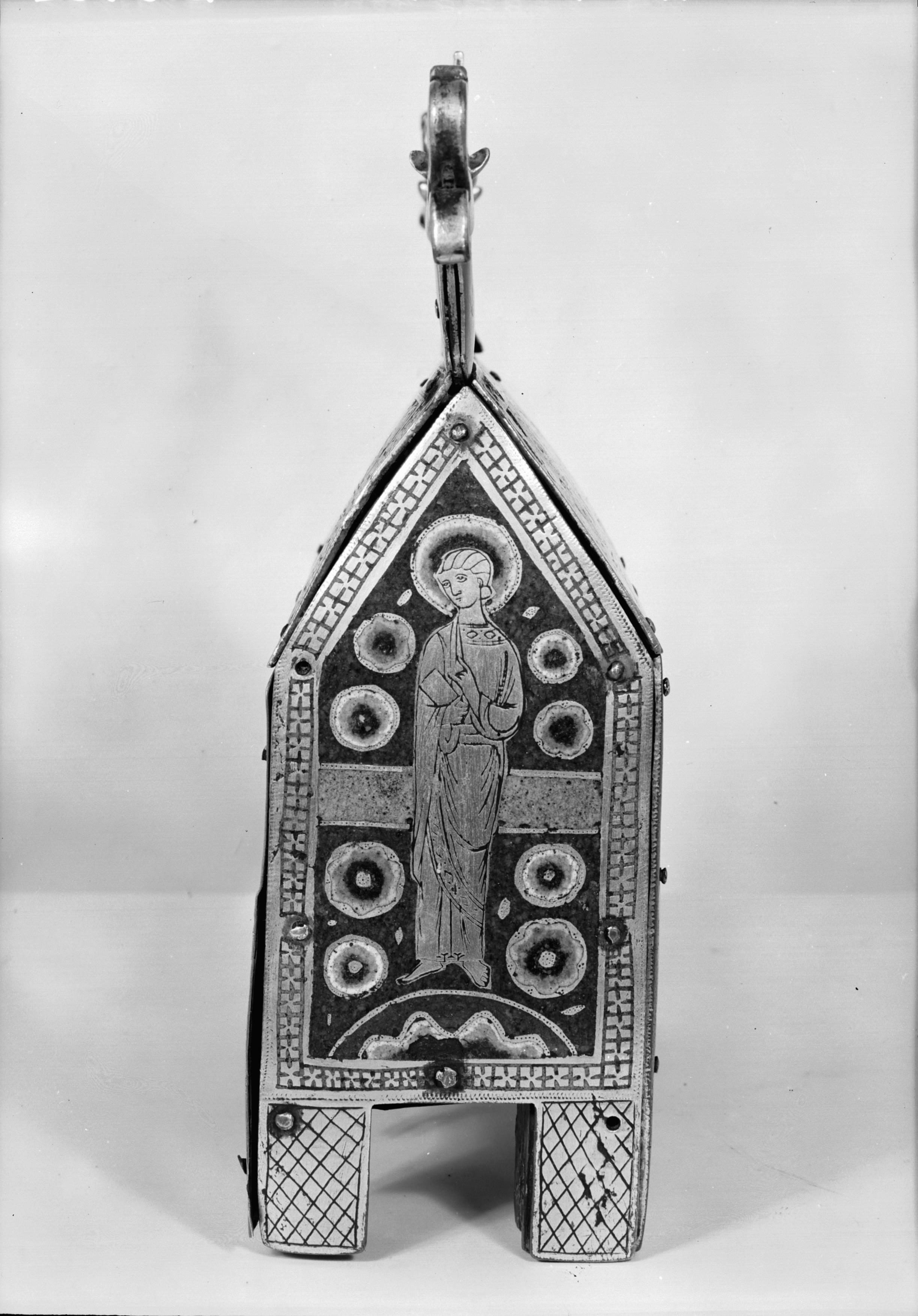 Relikskrin, på kortsidan manlig bild med bok. Troligen från 1100-talet slut.