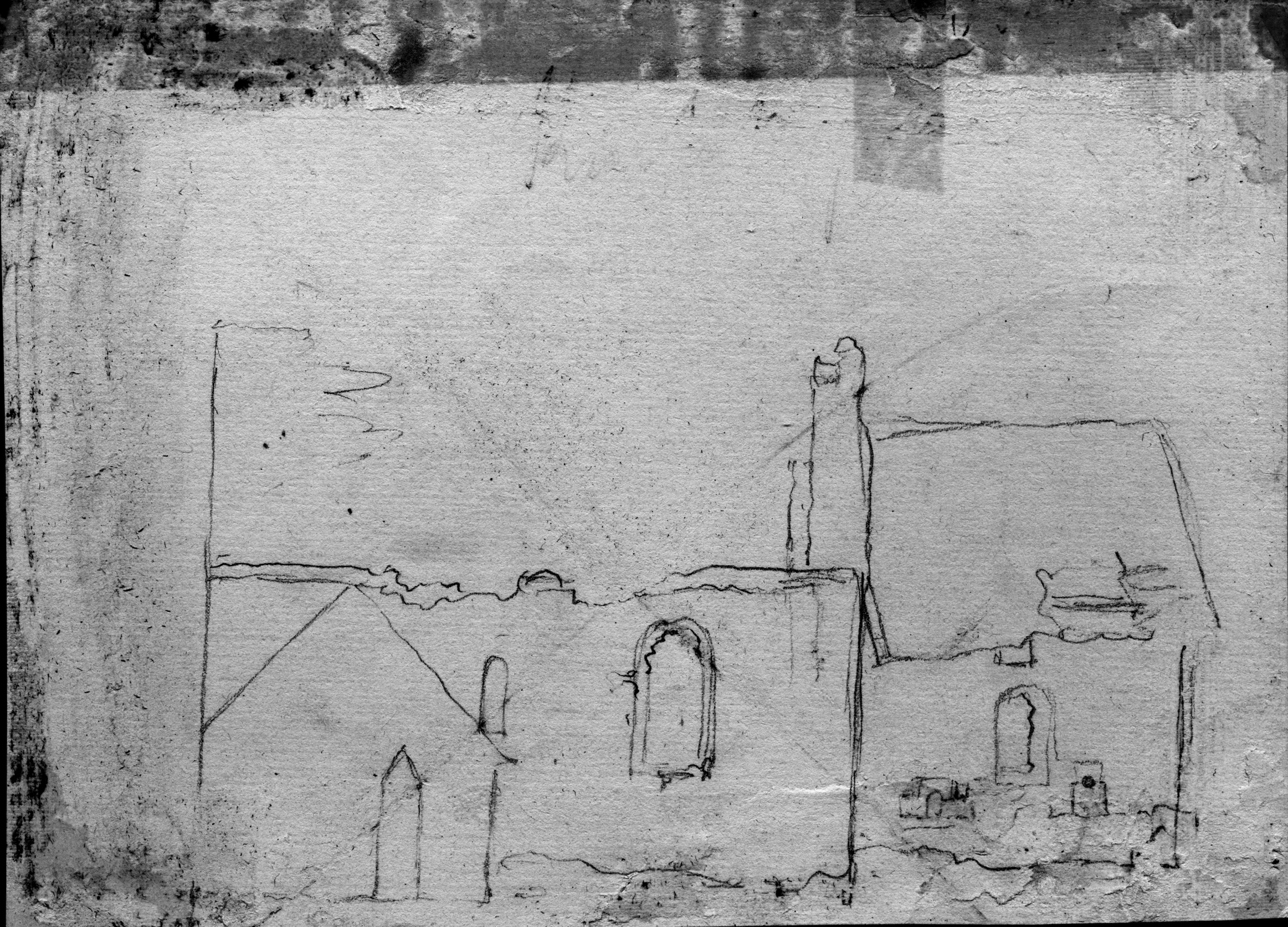 Kyrkan mot söder. Teckning, troligen från omkring 1850.