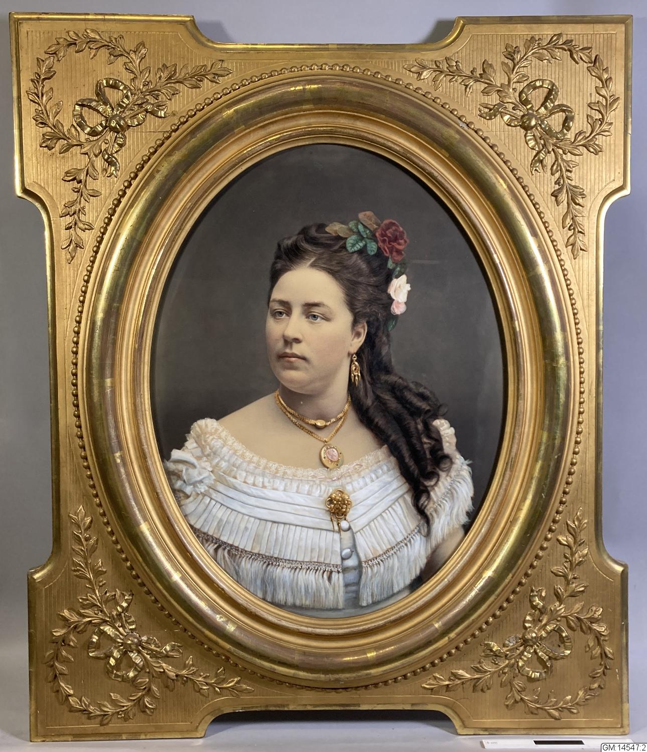 Ovalt handkolorerat porträttfotografi i förgylld ram.