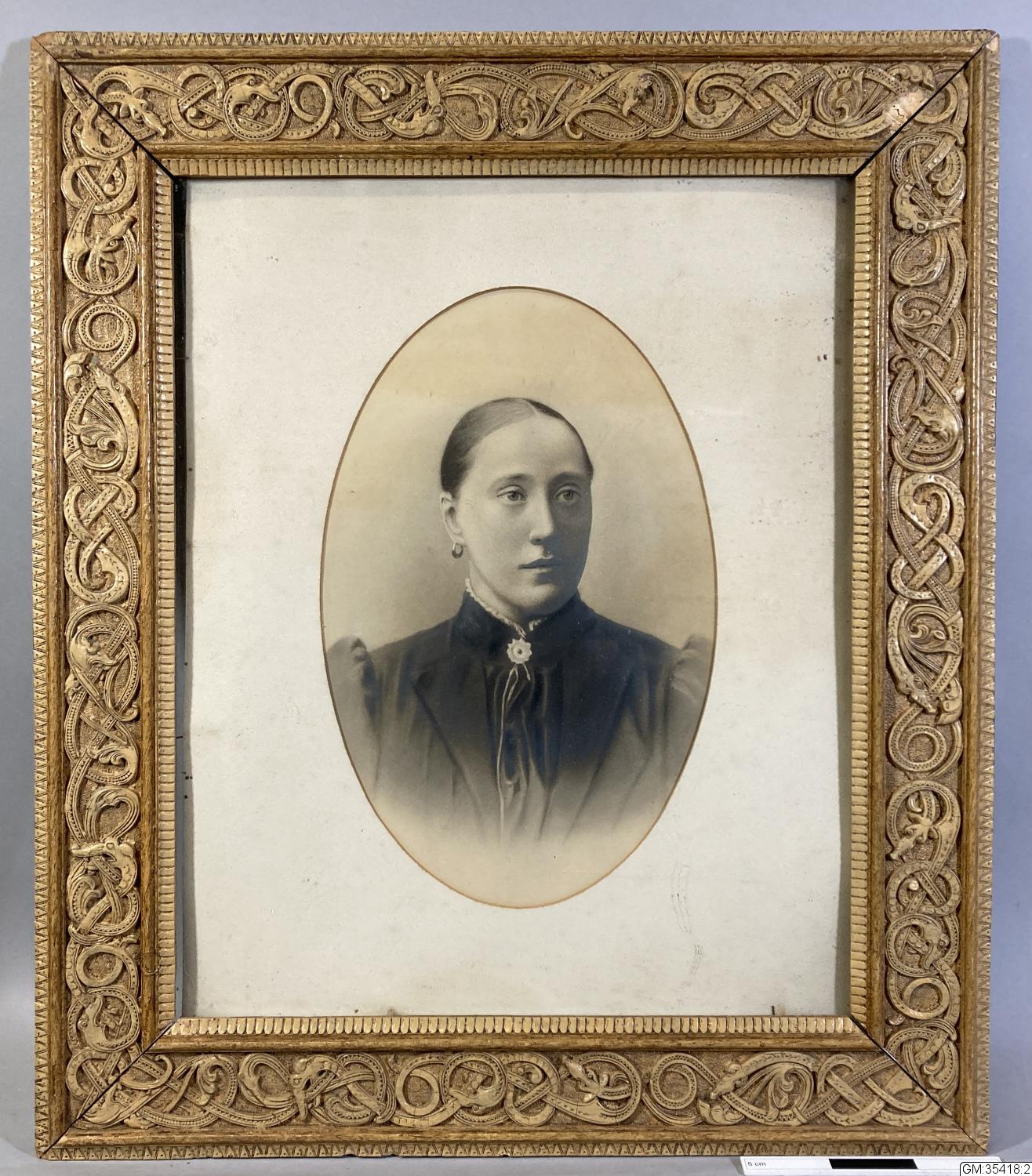 Porträttfotografi i ram i fornnordisk stil. Fotoförstoring partiellt förstärkt med kol.