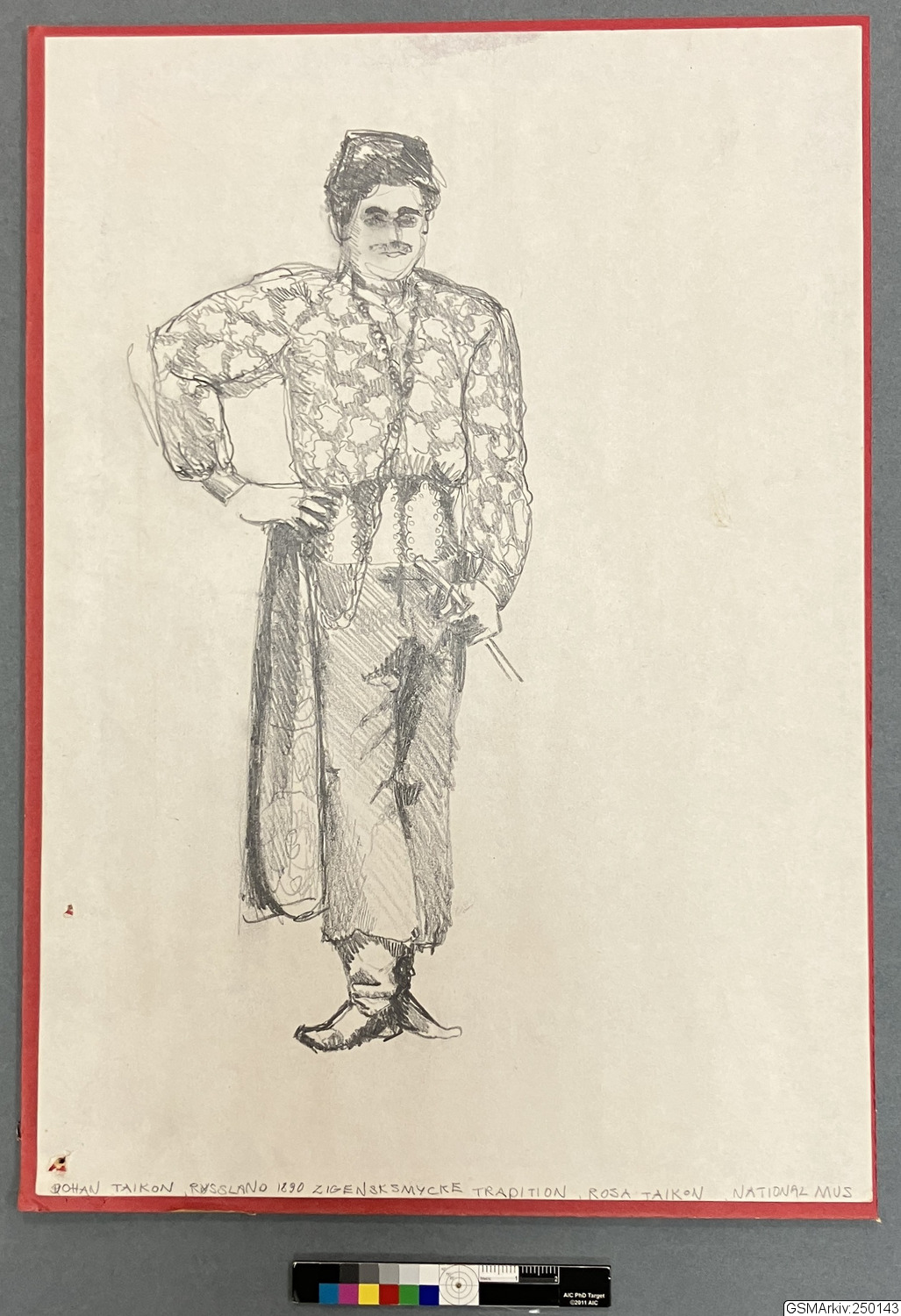 Blyertsskiss uppklistrad på kartong, föreställande man i orientaliska kläder. Nederst på bilden står "Johan Taikon, Ryssland 1890 Zigensk smyckestradition, Rosa Taikon, Nationalmus". Bilden är en teckning av ett fotografi på Johan Taikon från 1890.