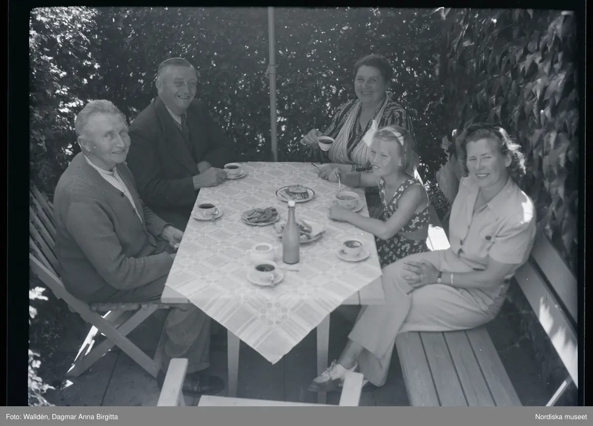 Ett sällskap sitter ute och fikar i en trädgård.