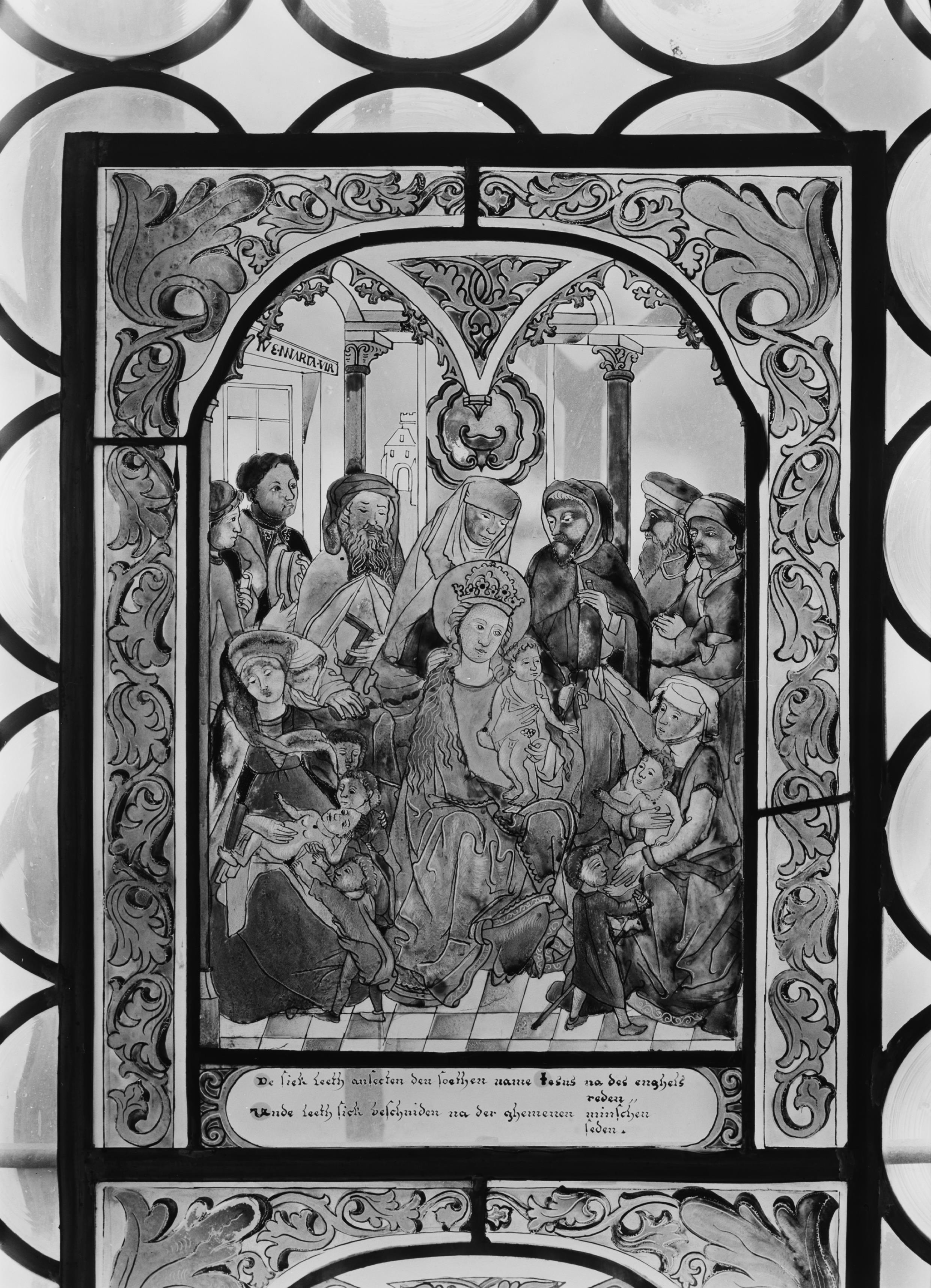 Glasmålning, detalj i korfönstret föreställande Heliga tre konungars tillbedjan.