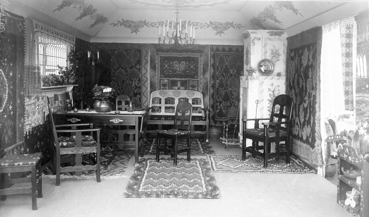 Från Baltiska utställningen i Malmö 1914. Gestrike Hemslöjdsförenings rum. Furumöbler ritade av Mattis Hahr-Grundell och ryor vävda på Hofors under Hedvig Ulfsparres ledning.
