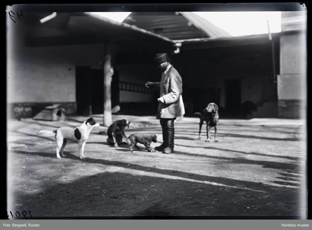 "Människor och djurbilder från Ryssland. Nikifer matar hundarna på gården"