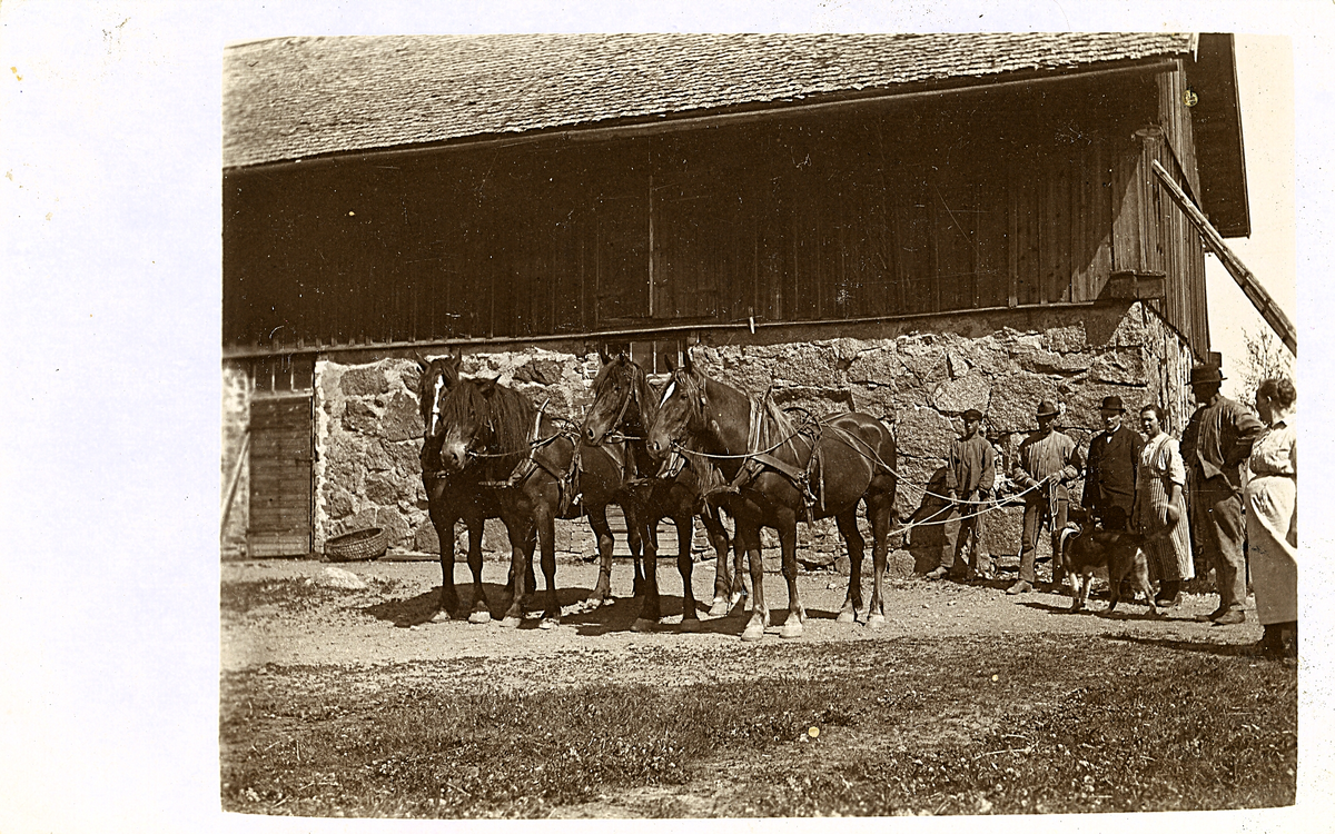 Flera hästar uppradade framför en lada med människor som står bredvid i gårdsmiljö. Text baksida kort: "De hjärtligaste lyckönskningar på Erika-dagen av Vermelins och mormor. Hjärtligaste helsningar till er alla från oss, vi har hälsan alla å önskar öven eder detsamma. Tack för helsningarna i Tildas ?".