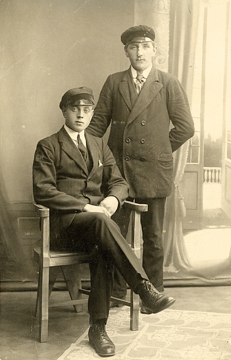 Porträtt av två män. Text baksida brevkort: "De hjärtligaste lyckönskningar på din 15-årsdag 1/8-1916 önskar din kusin Viktor". Adresserat till Fröken Hilda Forsberg, Brynäsg. 8 n. b. Gävle.