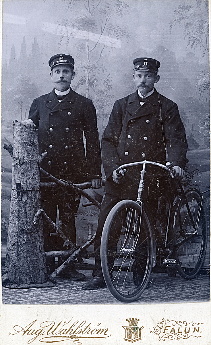 Två män i uniformsliknande kläder poserar med en tidig "säkerhetscykel" i en atelje, troligen runt slutet av 1800-talet.