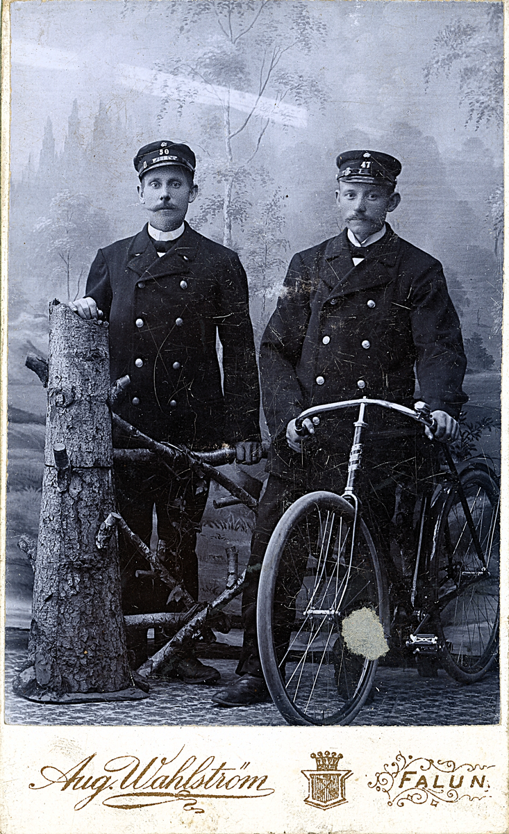 Två män i uniformsliknande kläder poserar med en tidig "säkerhetscykel" i en atelje, troligen runt slutet av 1800-talet.