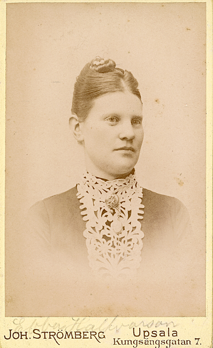 Porträtt av Ebba Halfvarsson (enligt text framsida och baksida kort).