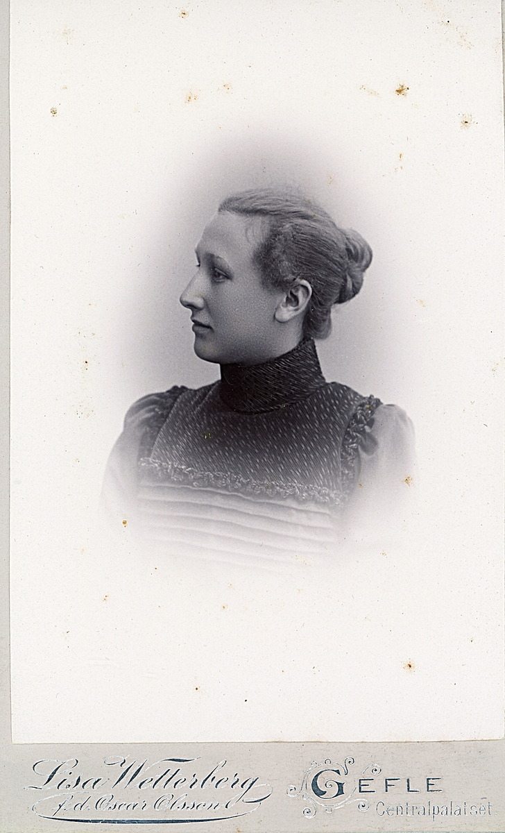 Porträtt av Mimmi Hillstedt, juni 1899 (enligt text baksida kort).