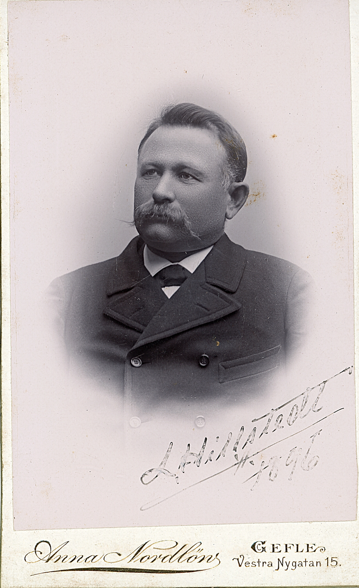 Porträtt av Olof Leonard Hillstedt, 1896. Född i Gävle 1849. Avled 1899 då hans skepp förliste med man och allt på resa mellan Grimsby, England och Stockholm.