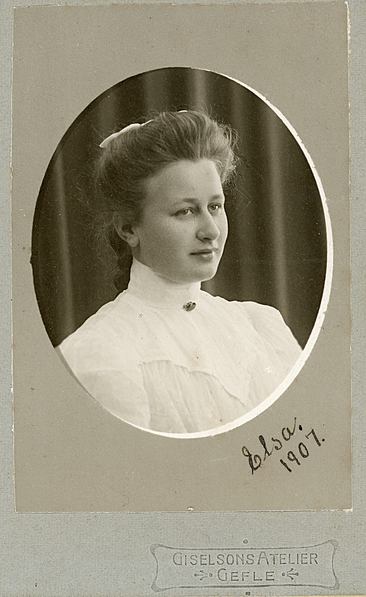 Kvinnoporträtt. Text framsida kort: "Elsa. 1907".