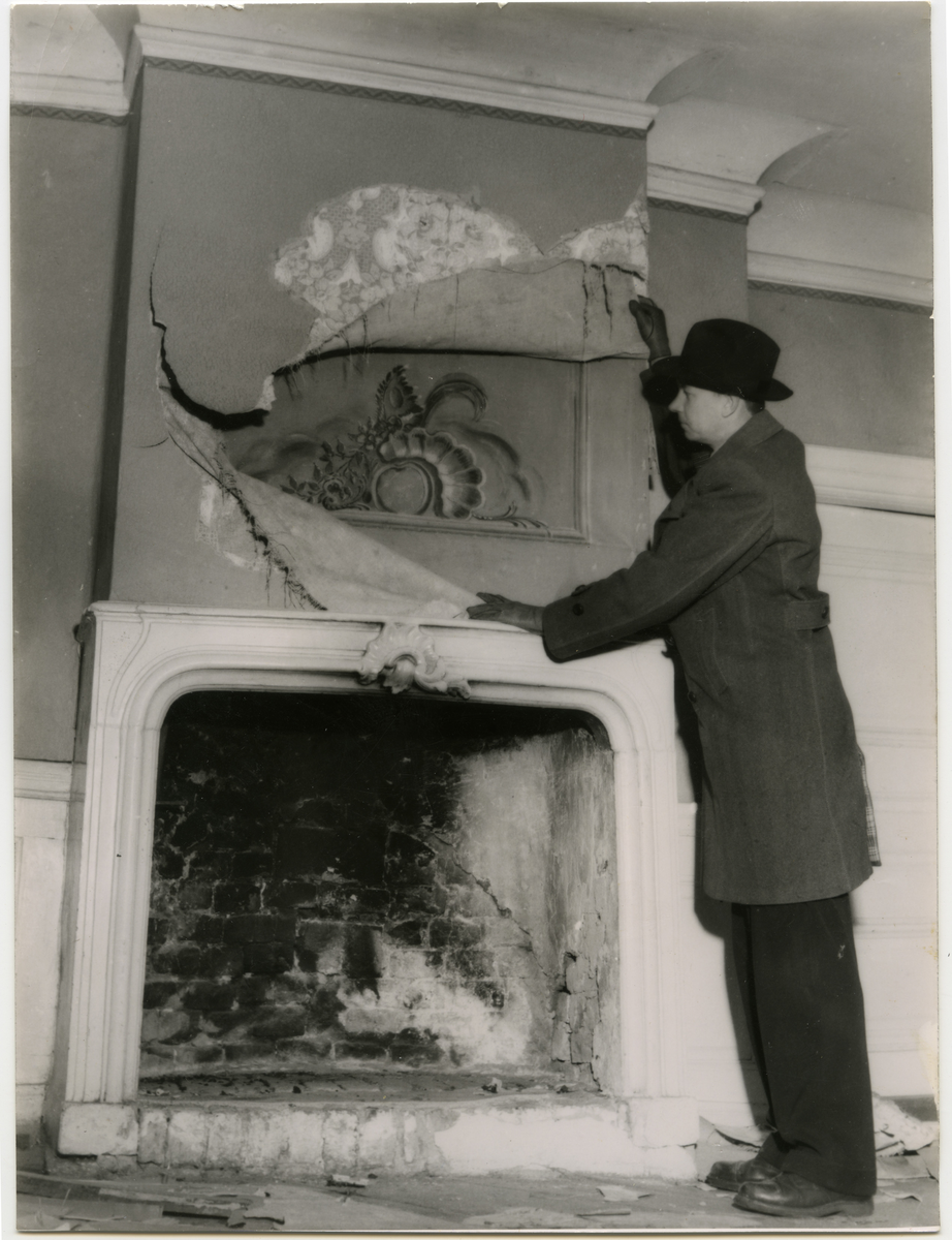Östanå - Gränna socken. Interiör. Landsantikvarie Gunnar Swanström. Kakelugn och gammal väggmålning