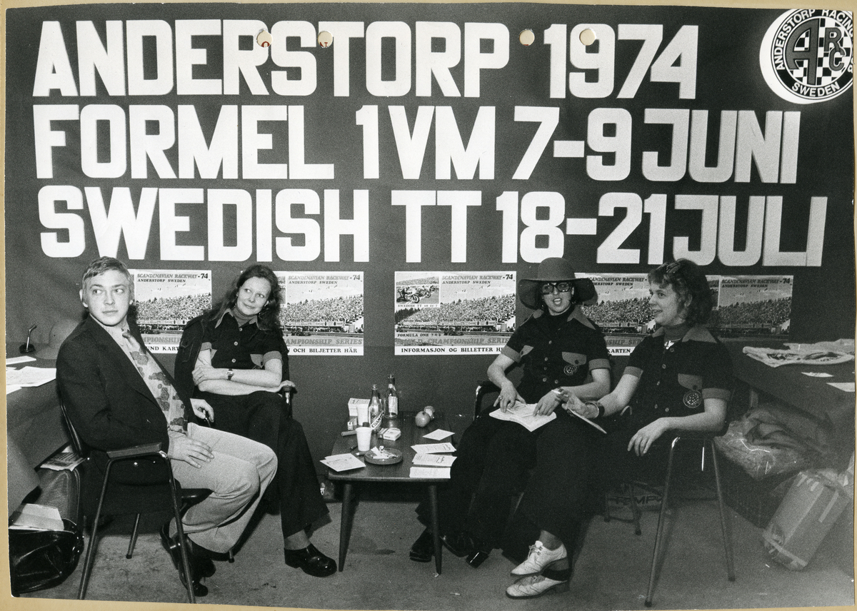 Motormässan i Malmö 1974, avdelningen med Anderstorp Racing Club Sweden, med reklam för motortävlingar på Scandinavian Raceway i Anderstorp 1974. Från vänster Anders Åberg, från ARC:s damsektion: Annika Sjöö, Marita Junehill och Britt-Marie Lindström.