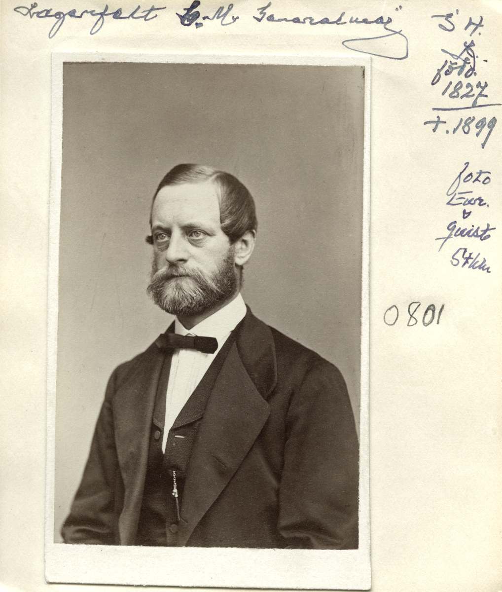 Porträtt av friherre Melker Lagerfelt. Född 1827 på Charlottenborg i Motala som son till friherre Melker Otto Lagerfelt och Vilhelmina Sofia Karolina Wassrin. Från 1847 i militär tjänst vid Första livgrenadjärregementet i Linköping. Överste och regementets chef från 1879. Vidare avsked 1890 med generalmajors grad. Död i Linköping som ogift 1899. Här avbildad omkring 1875.