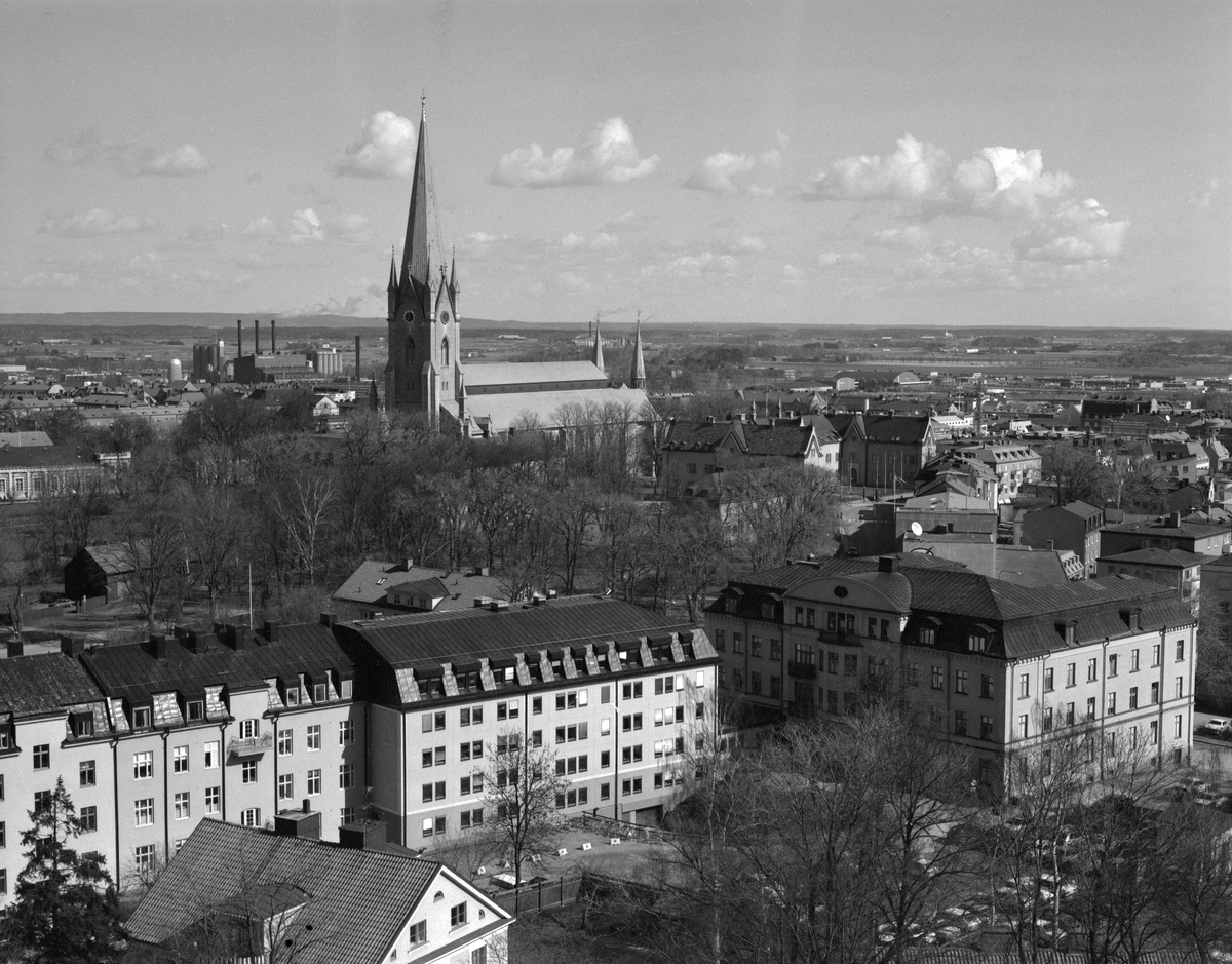 Vy över Linköpings centrala delar med utgångspunkt från stadens gamla vattentorn.