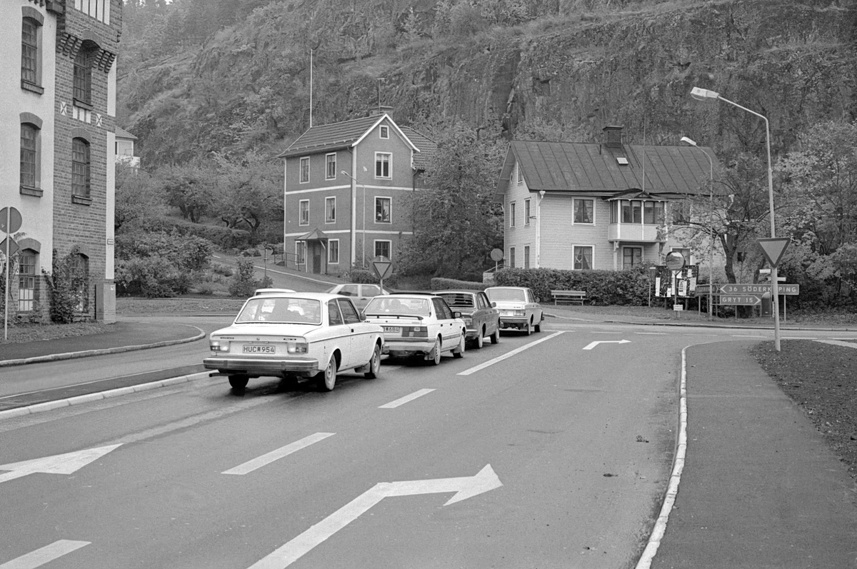 Storgatan i Valdemarsvik mot korsningen för val mot Söderköping alternativt Gryt. I fonden hukar fastigheterna Kyrkogatan 1 och 3 mot bergväggen.