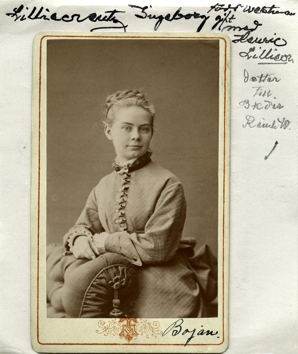 Påskriften "Bojan" gör oss något mer familjära med fröken Ingeborg Westman, trots avståndet i tid och kanske även rum. Dotter till direktören vid Östgöta Enskilda Bank i Linköping, Reinhard Westman och dennes maka Elisabeth Henrietta Berg. Född på godset Tolefors i Kärna socken och från tioårsåldern uppvuxen i Linköping. Som vuxen gift med friherren och kaptenen Henrik Lilliecreutz. Makarna var efter vigseln bosatta i Växjö. Här i ett ungdomsporträtt från uppskattningsvis 1870-talets senare hälft.