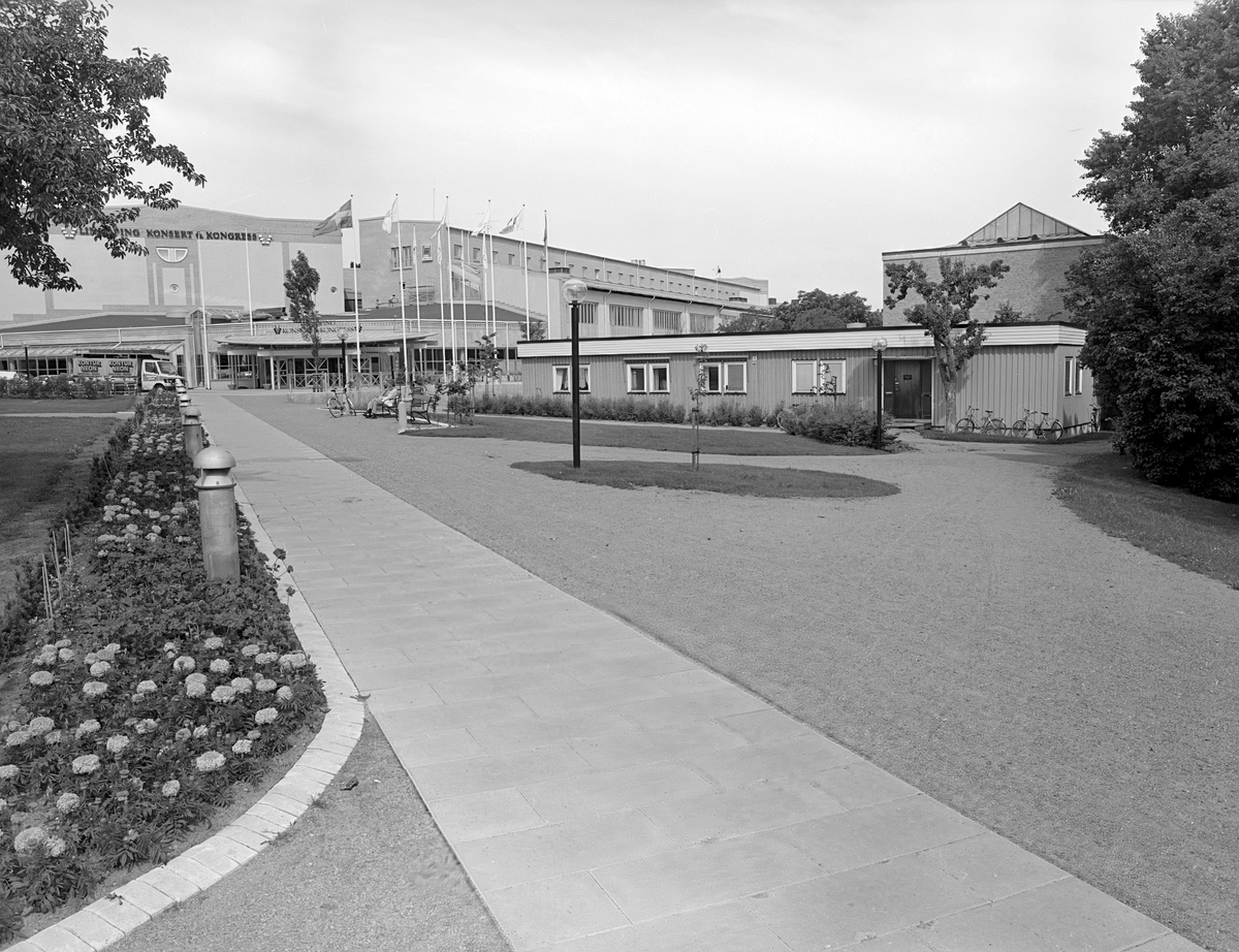 År 1987 invigdes efter stormiga turer den nya konsert- och kongressbyggnaden i Linköping. Till höger skymtar gaveln till Östergötlands museum, vars personal sedan en tid varit hänvisade till bildens barack för sina kontor. Foto 1988.