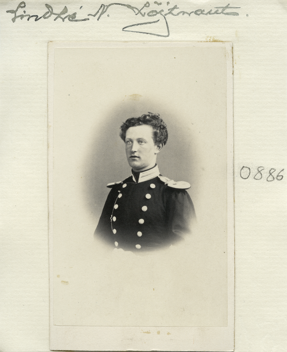 Vinjetterat porträtt av löjtnant Nils Lindhé. Från 1862 underlöjtnant vid Första livgrenadjärregementet i Linköping. Majors avsked 1896. En tid var han även vikarierande gymnastiklärare vid Norrköpings högre allmänna läroverk. Gift med Ida Maria Arnell. Foto omkring 1865.