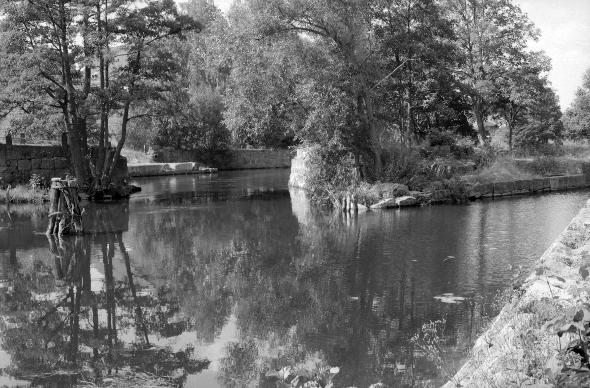 Den gamla bron över Stångåns flöde genom Hjulsbro 1996. Efter den nya brons tillkomst 1952 tappade den gamla i betydelse och blev i avsaknad av underhåll med tiden undermålig. Vid tiden för bilden var bron sedan en tid avstängd och körbanan över den norra broöppningen avlägsnad. Sedan 2014 är passage åter möjlig. I bildens höger sida skymtar genomfarten till Hjulsbro sluss.
