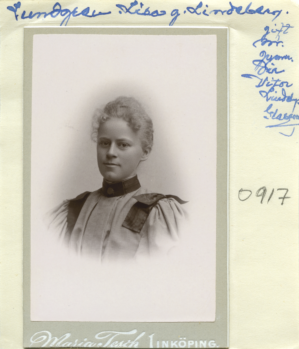 Porträtt av Elisabet Lundgren. Dotter till apotekare Frans Gustaf Lundgren och makan Carolina Wilhelmina Jonsson. Från 1898 gift med sjukgymnasten Viktor Lindeberg. Efter giftemålet bosatte sig makarna i Glasgow. Efter en tid åter i Linköping flyttade de ånyo till Glasgow 1908. Foto omkring 1895.