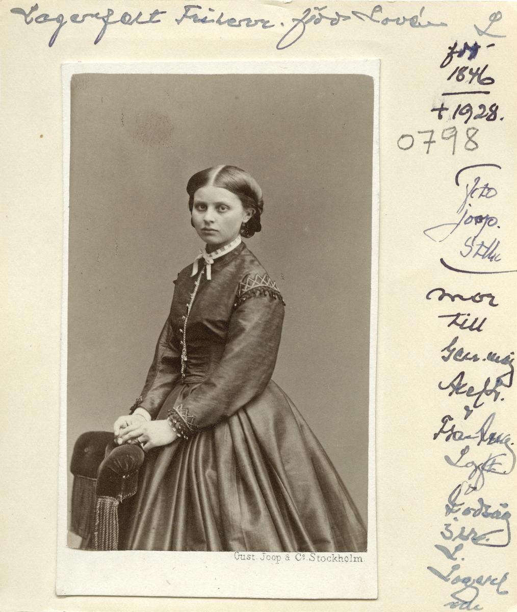 Porträtt av Hedvig Lovén. Dotter till generalmajor Peter Christian Lovén och Hedvig Augusta De Geer. Själv gift 1866 med friherre Gustaf Lagerfelt. Makarna var bosatta på familjeegendomen Lagerlunda i Kärna socken. Här fotograferad i Stockholm omkring 1965.